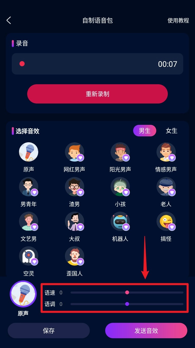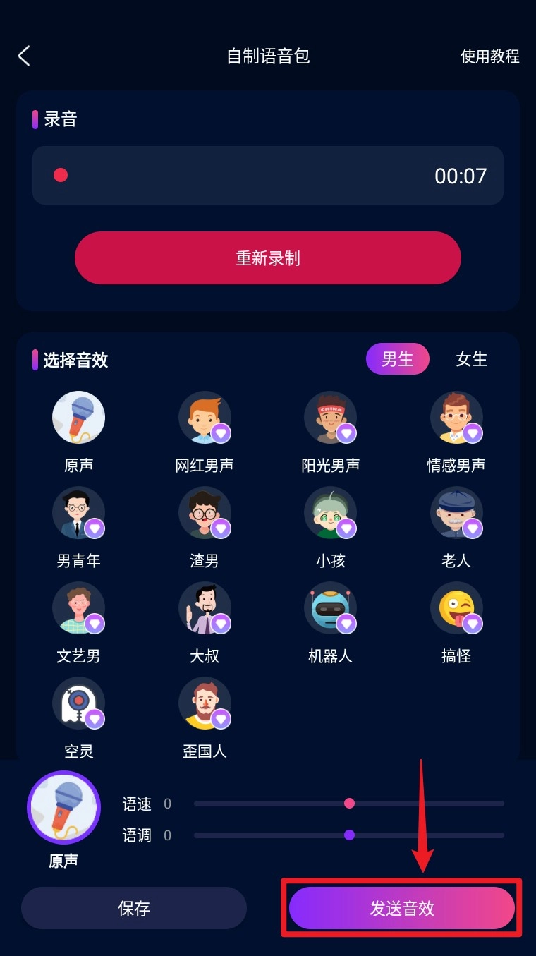 5. 完成设置后,点击右下角的发送音效按钮,就能完成语音包的生成。