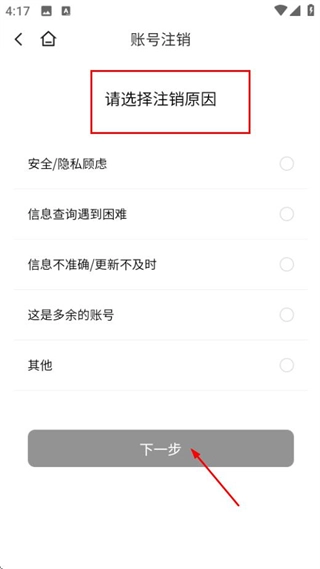 4、在账号注销页面,选择注销原因后点击下一步按钮,进入注销确认页面。