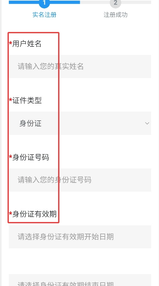 3、在实名注册页面填写用户姓名、证件类型、身份证号以及证件有效期。