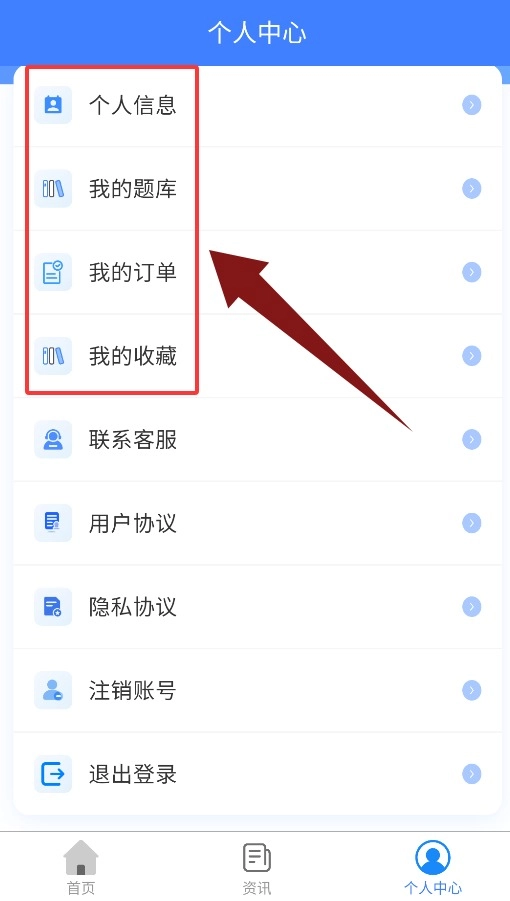 4、在个人中心里,你可以查看个人信息、我的题库、订单记录以及收藏夹这些内容。