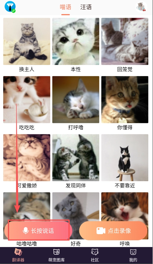 1、猫语翻译器软件的操作十分简便,用户仅需录制猫咪的叫声或是拍摄照片就行。
