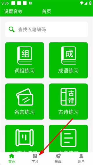 1、打开应用首页后,能看到用于查找五笔编码的搜索框,以及词组练习、成语练习、名言练习、古诗练习等功能入口,点击底部的“学习”选项,即可进入学习功能页面。
