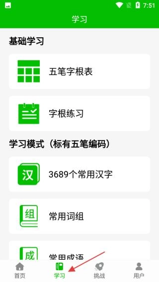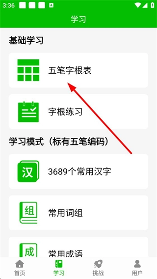 2、点击学习选项进入学习页面后,可看到基础学习板块中的五笔字根表字根练习选项,以及设有五笔编码的学习模式板块,该板块涵盖常用汉字等学习内容。