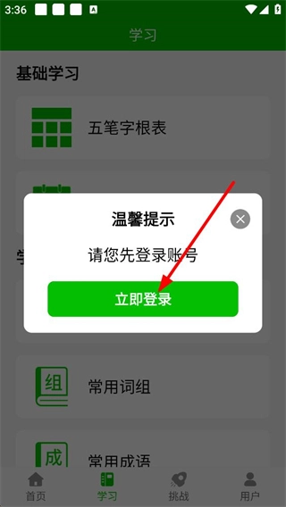 3、在选择基础学习板块内的选项后,系统会弹出“请先登录账号”的温馨提示,点击提示中的“立即登录”按钮,就能进入用户登录操作页面。