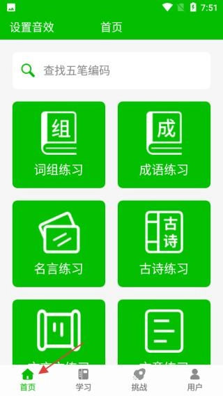 1、首页设计简洁明了,设有搜索框可查询五笔编码,同时提供词组、成语、名言、古诗等练习入口,助力开启多样化学习模式。