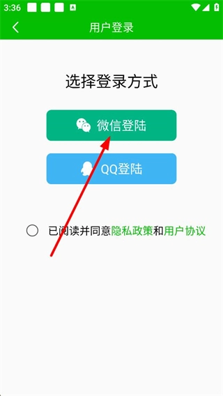 4、进入用户登录页面后,可选择微信登录或QQ登录的方式,需先勾选已阅读并同意隐私政策和用户协议,再进行对应方式的登录操作。