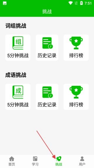 3、进入挑战页面,你会看到词组挑战和成语挑战两类内容,每轮挑战限时5分钟;页面还设有历史记录和排行榜功能,能为学习过程增添趣味性与竞技性。