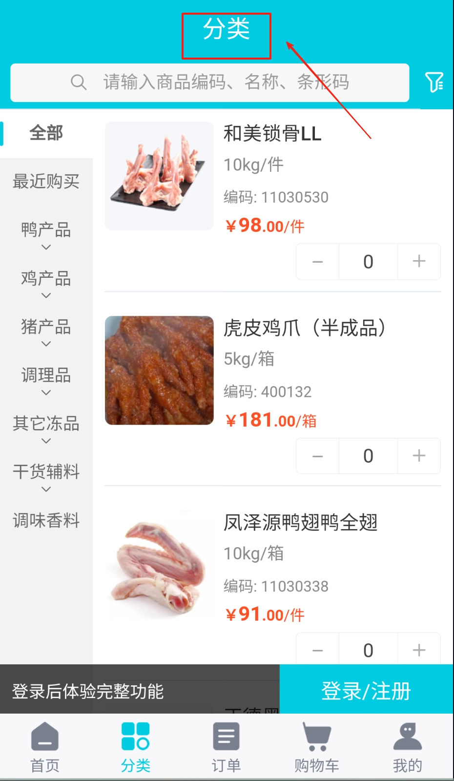 1、点击分类图标浏览冻品目录,按食材类型筛选目标商品。