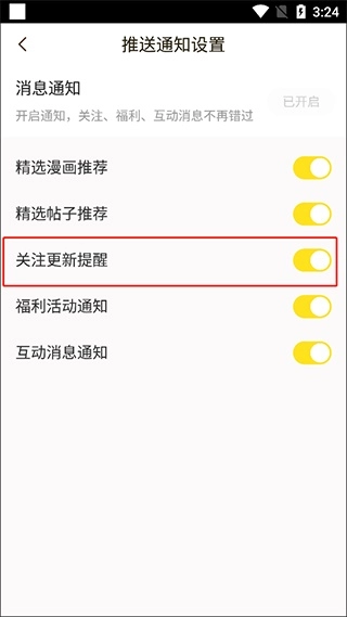 5、轻点关注漫画更新提醒选项右侧的开关。