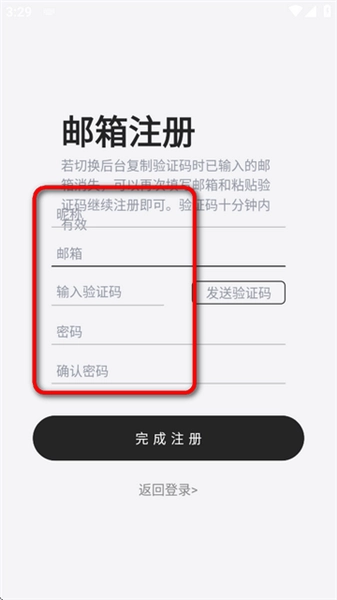 2、需要输入昵称,邮箱及验证码和两次密码。