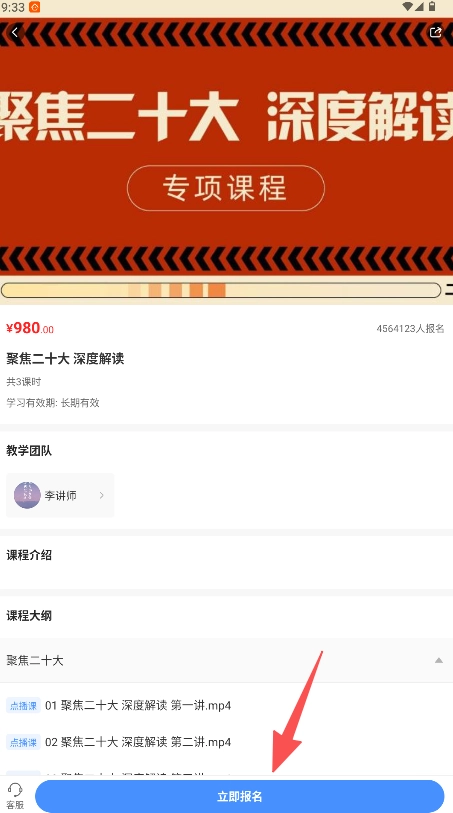 3、您可以在详情页查看课程大纲和价格,之后点击“立即报名”按钮,即可完成课程购买操作。