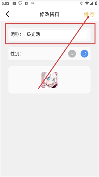 4、进入修改资料页面后,编辑【昵称】等相关信息,随后点击页面右上角的【保存】按钮,就能完成个人资料的更新流程。
