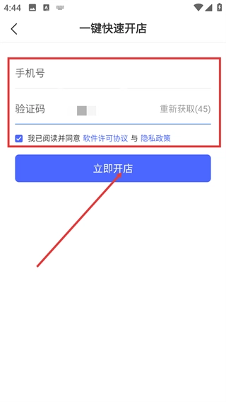 2、开店流程里,填写【手机号-验证码】,确认协议后点击【立即开店】按钮,就能快速推进开店步骤,既高效又便捷。