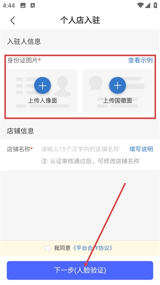 4、进入个人店铺入驻界面,上传【身份证人像面图片和国徽面图片】,填写店铺名称后点击【下一步(人脸验证)】,即可完成提交操作。