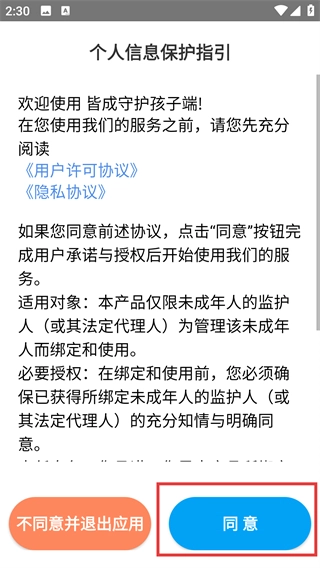 1、点击【同意】按钮,确认已阅读【用户许可协议】与【隐私协议】,即可开启【皆成守护孩子端】服务的使用。