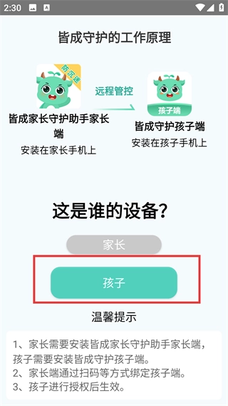 2、选择设备类型为【孩子】,家长端需安装在家长的手机上,孩子端则安装在孩子的手机上,之后借助扫码等方式来完成绑定操作流程。