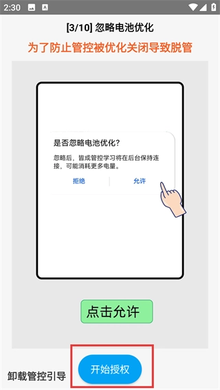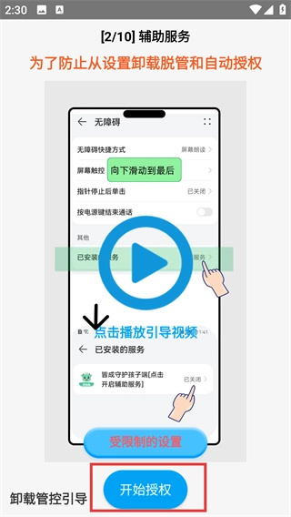 3、点击【开始授权】,开启【辅助服务】,这样可以防止应用从设置中被卸载而导致脱管,从而确保家长设置的管控策略能够持久生效。