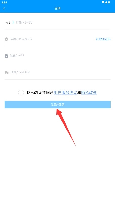 1、输入手机号和验证码,设置密码,输入企业名称,勾选同意协议后点击注册并登录进入。