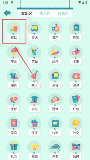 3、在类目列表里选择合适的支出类目,使账单记录更加精准且有条理;