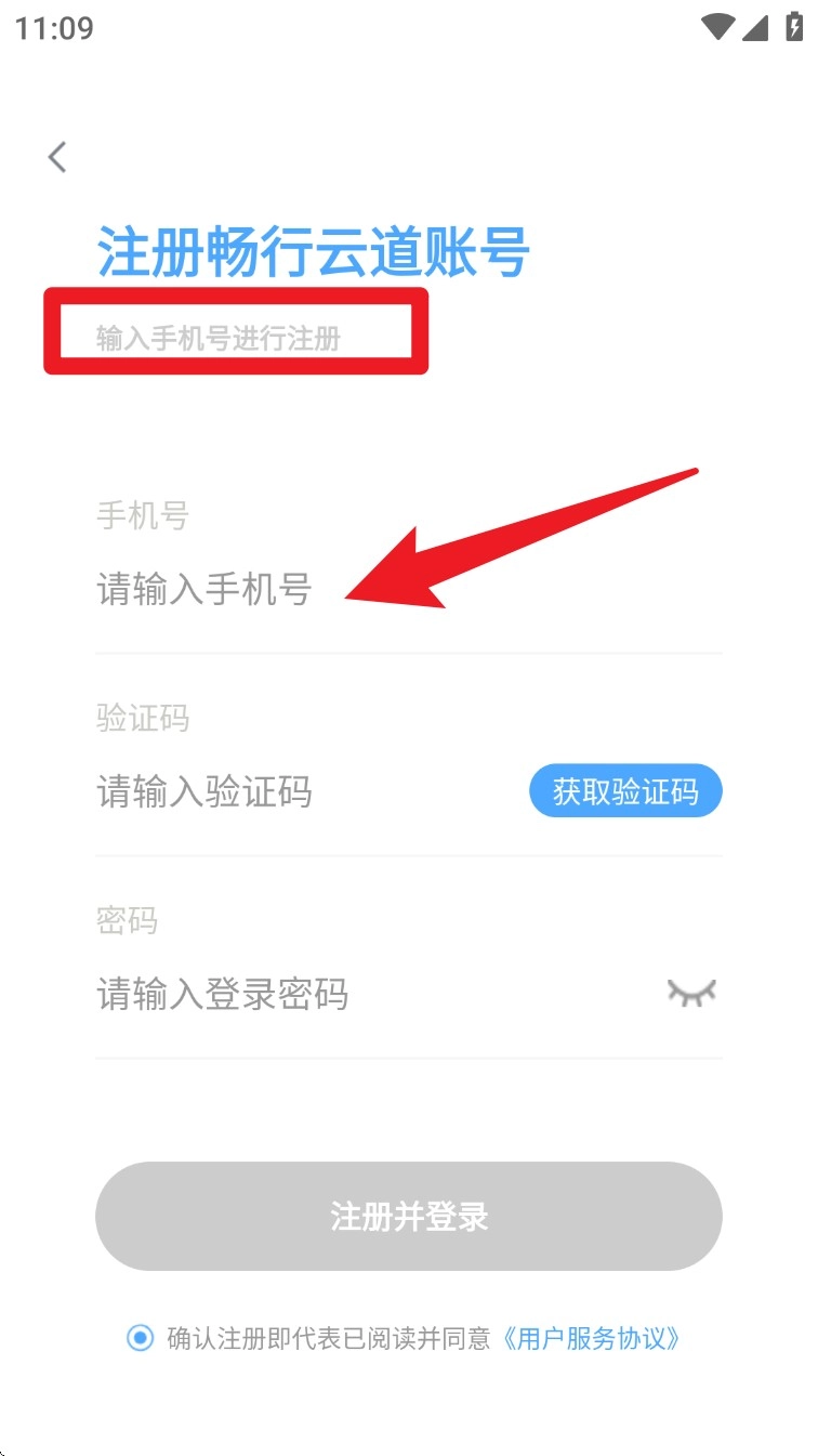 1. 打开应用后,点击“注册畅行云道账号”选项,依次输入手机号、验证码和密码,随后提交注册信息。