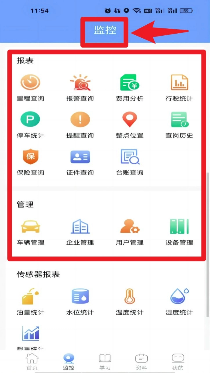 3. 登录后点击底部的监控按钮,进入车辆监控板块,就能查看实时视频、轨迹回放等相关信息。