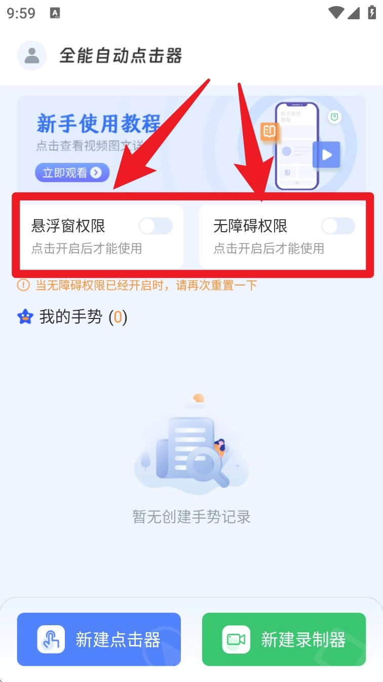 1. 进入首页后,需先依次开启悬浮窗权限与无障碍权限,方可使用点击功能。
