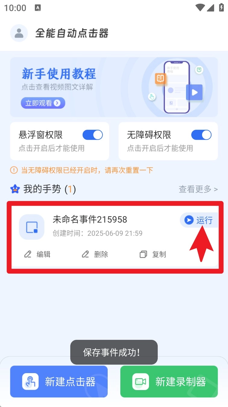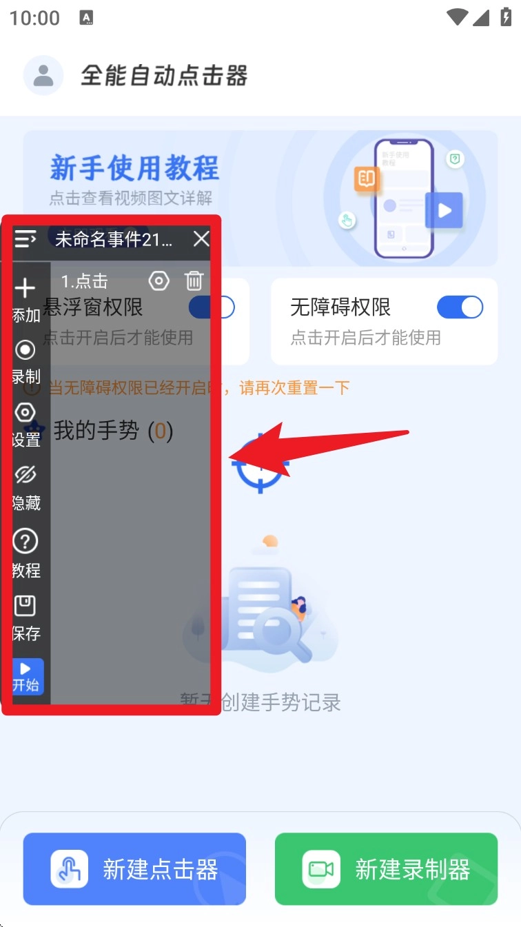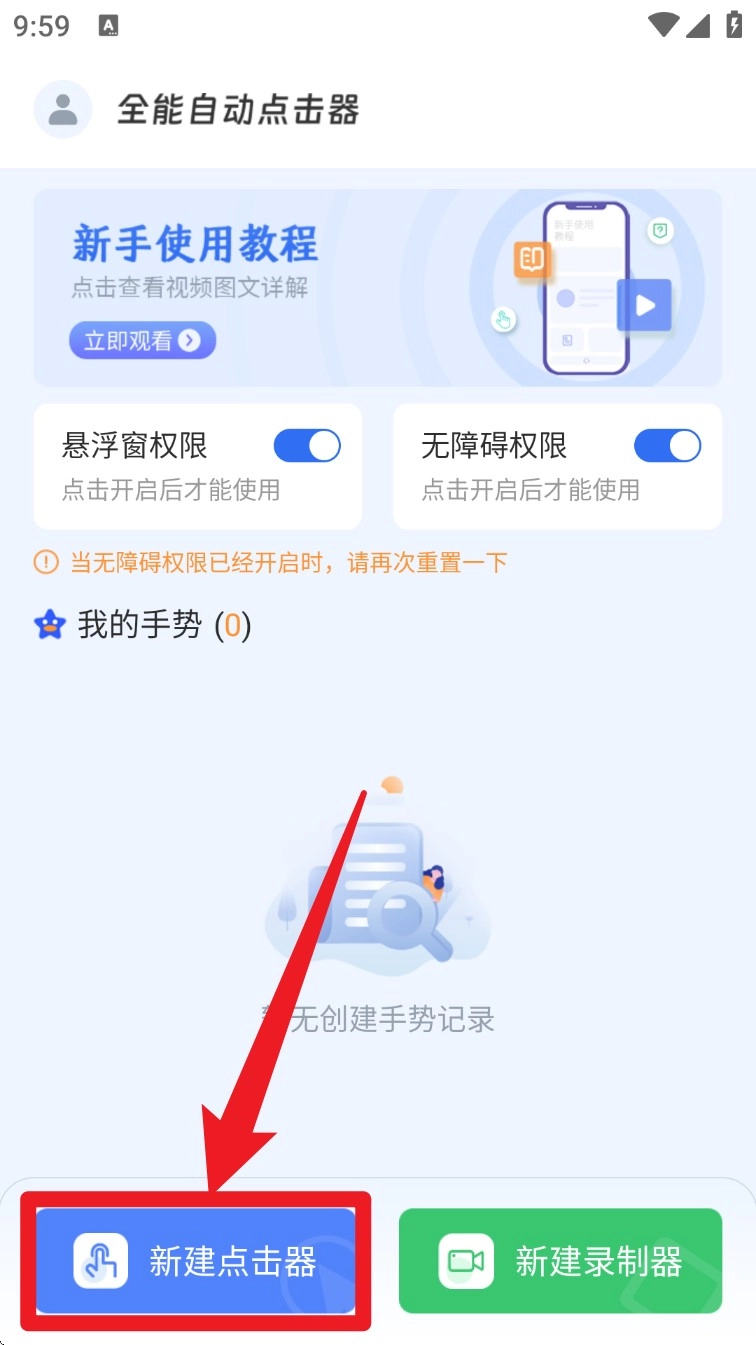 2. 权限开启后,点击底部的“新建点击器”按钮,即可着手设置自动点击的事件流程。