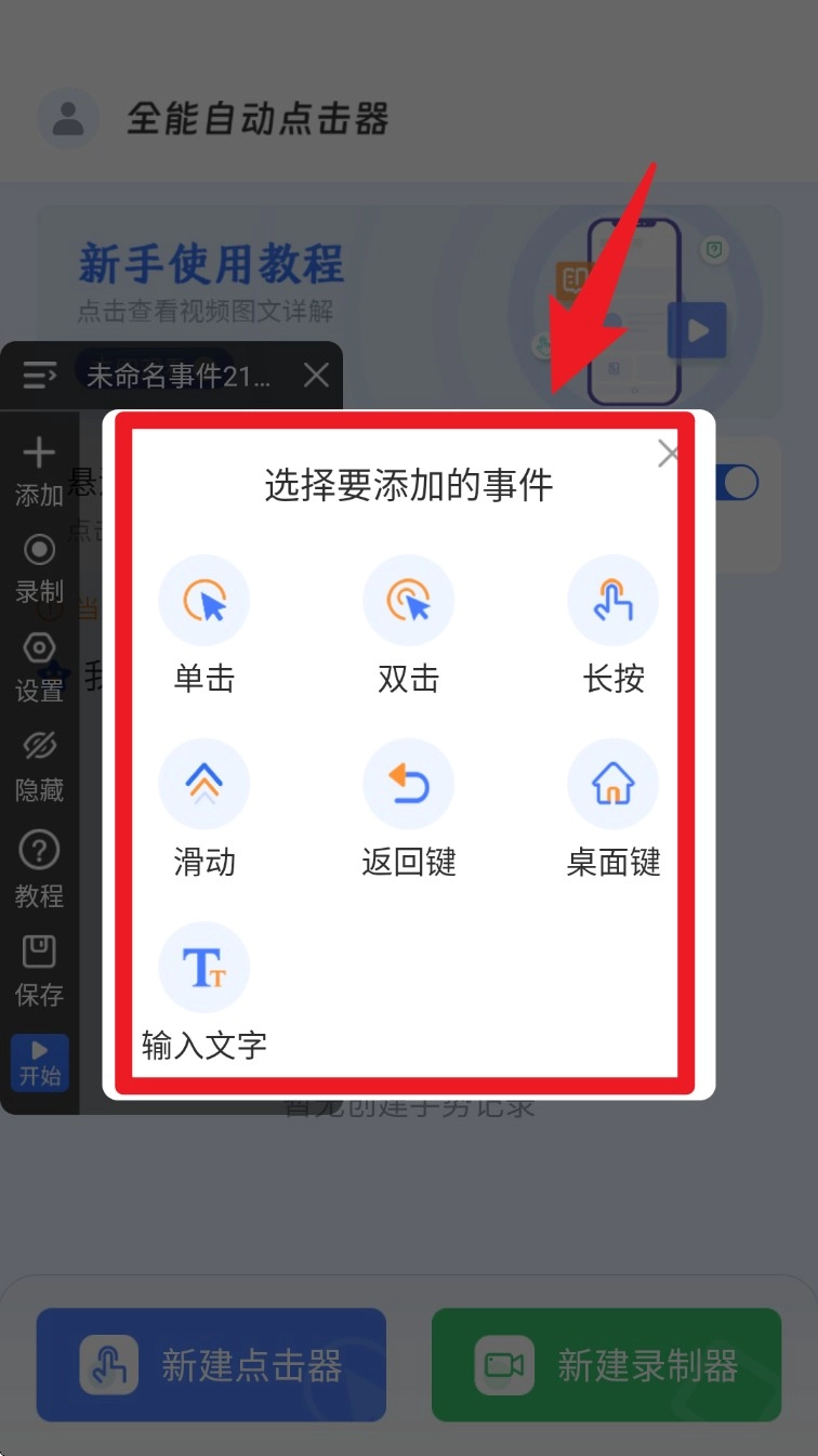 3. 挑选要添加的事件类型,像点击、滑动、返回键、长按或者输入文字这类操作。
