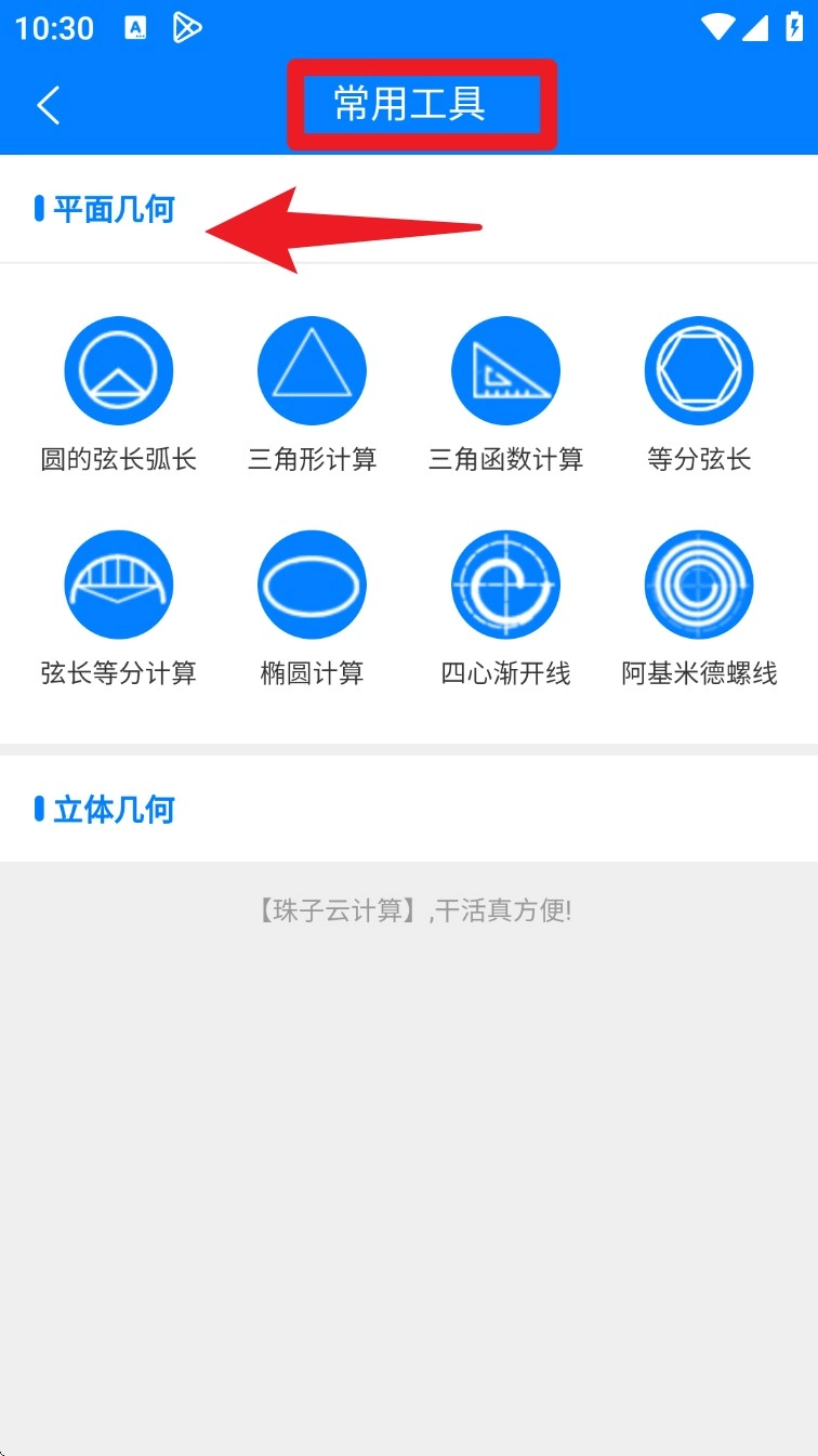 3. 在常用工具里找到平面几何栏目并点击,接着从中挑选你所需的几何计算模块,像圆的弦长弧长这类都可以。