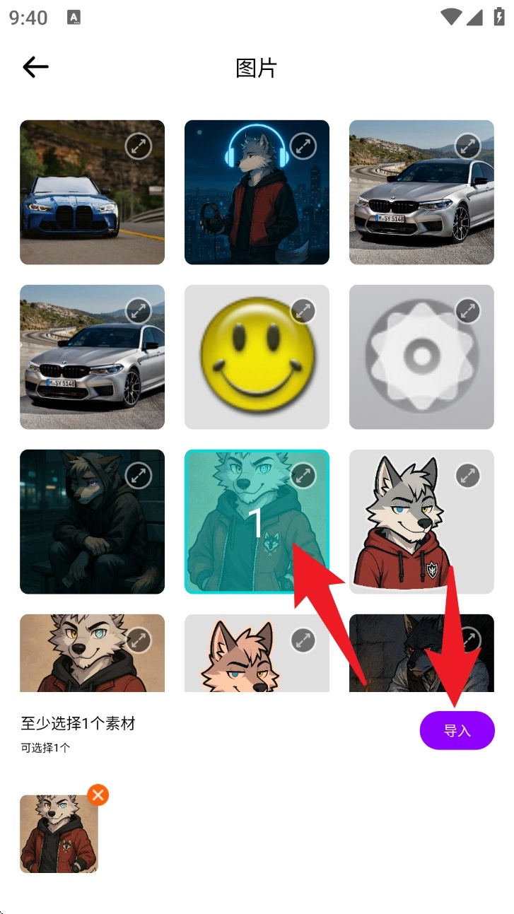 2. 进入图库后,从本地图片中选择至少一张素材图,点击右下角导入按钮即可进入图片编辑界面进行下一步操作。
