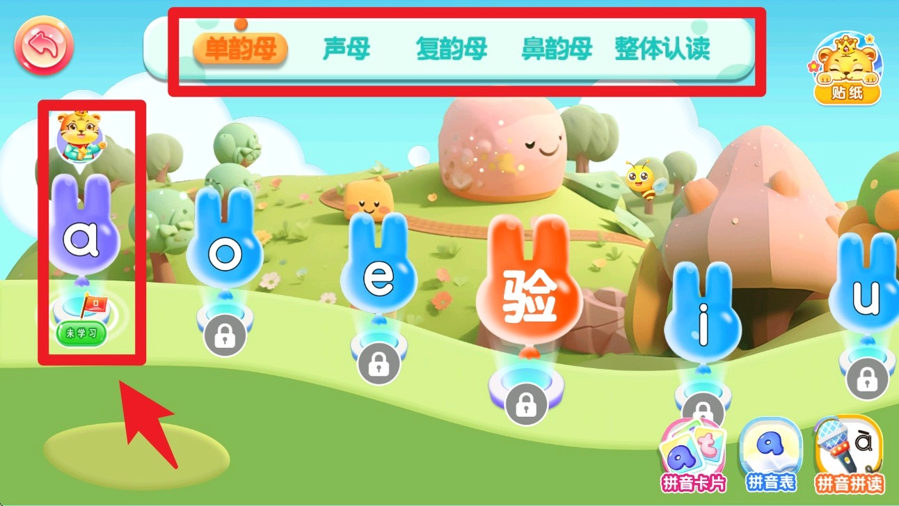 3. 在课程选择界面中,孩子可以点击解锁的单韵母卡片开始学习,系统会按照学习进度逐步开放后续内容。