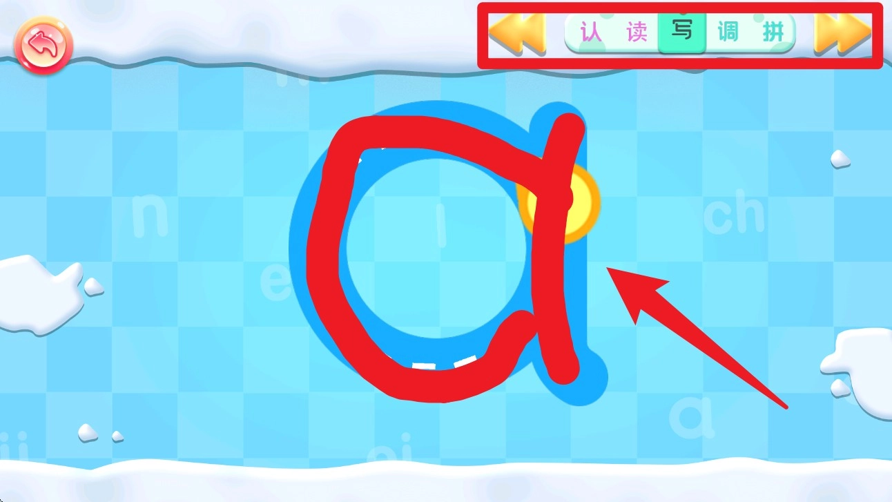 4. 进入拼音书写界面后,孩子可跟随动画轨迹练习字母笔顺,通过手指滑动完成写阶段互动任务。