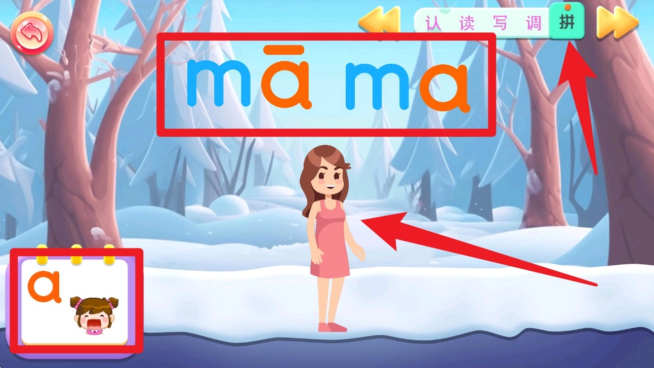 5. 完成书写后进入拼环节,系统会展示带拼音的词语并配合语音朗读,帮助孩子理解拼音组合和实际应用。