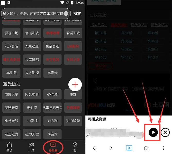 软件的“播放器”栏目里还整合了一些其他资源站。要是在软件内部搜索不到想要的内容,可以通过这个界面进入其他资源站继续查找。找到资源并开始播放后,系统会自动嗅探出播放链接,随后跳转到播放器进行播放。