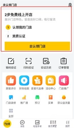 2、登录美团商家版后,会进入工作台界面。在这里,您需要通过两步完成免费线上开店流程:第一步是认领您的门店,第二步是进行资质认证。这两步完成后,您就能使用软件的各项功能了。
