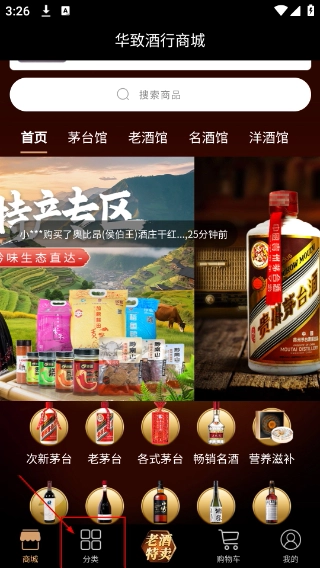 1、进入【华致酒行商城】首页,用搜索栏搜索商品,切换茅台等分类标签,点击底部【分类】按钮,进入商品分类页面。