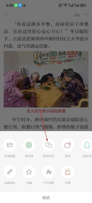 4、在弹出的分享菜单中点击微信好友选项,可将这条资讯分享给微信好友,传递相关新闻内容。