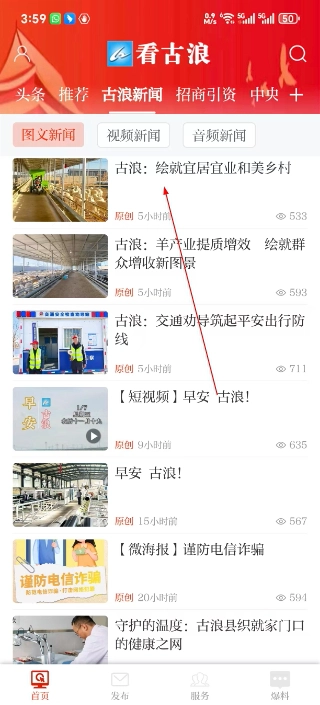 1、打开看古浪首页,点击古浪新闻选项,切换到古浪新闻板块,可查看当地相关的各类新闻内容。