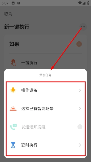 4、在任务选择菜单中,能够挑选“操作设备”“发送通知提醒”等任务类型,对场景的具体执行动作进行配置。