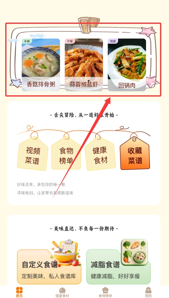 1、进入软件首页,就能看到早午晚餐的推荐内容;向下滑动页面,会出现视频菜谱、自定义食谱等板块;底部的导航栏可以用来切换不同页面。