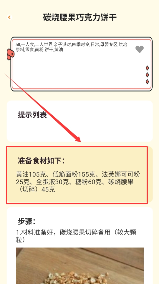 做烘焙时,先找到对应的分类,比如饼干教程,查看所需的黄油、糖粉等食材的克重,然后按照步骤提示准备好材料,就可以开始制作啦。