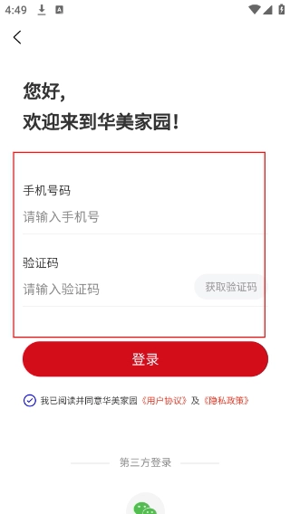 4、进入登录页面,输入手机号码,点击【获取验证码】,再点击【登录】按钮,即可完成账号登录操作。