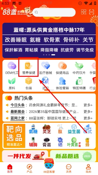 1、打开88蓝平台首页后,找到并点击【营养保健】分类的入口,即可进入营养保健类产品的展示页面。