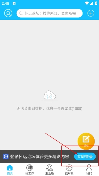 2、进入【怀远论坛】首页后,若出现无法请求数据的情况,可点击【立即登录】按钮,从而进入论坛的登录相关操作流程。