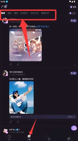 2、进入广场页面后,可从推荐、最新等标签里选择感兴趣的内容类别。