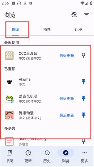 2、进入浏览页面的【图源】栏后,能看到腾讯动漫等多个资源平台选项,大家可以根据自己的需求进行选择。