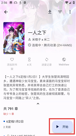 4、在《一人之下》的详情页点击右下角的【开始】按钮,即可开启这部作品的阅读之旅。