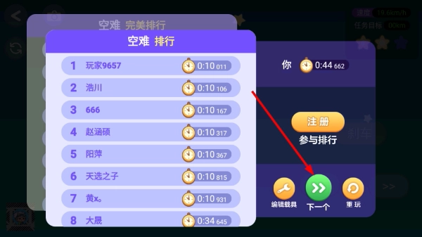 4、完成当前关卡后,在排行榜界面点击“下一个”按钮,就能开启下一个关卡的挑战,继续推进游戏进程。