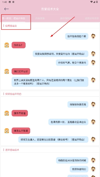 3、切换到【约会全套】分类,就能看到适合约会场景的完整话术流程,帮助你更好地进行交流表达。