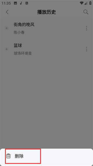 4、在操作菜单中选择【删除】选项,即可将该歌曲从播放历史里移除,完成播放记录的清理。